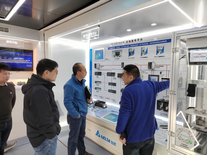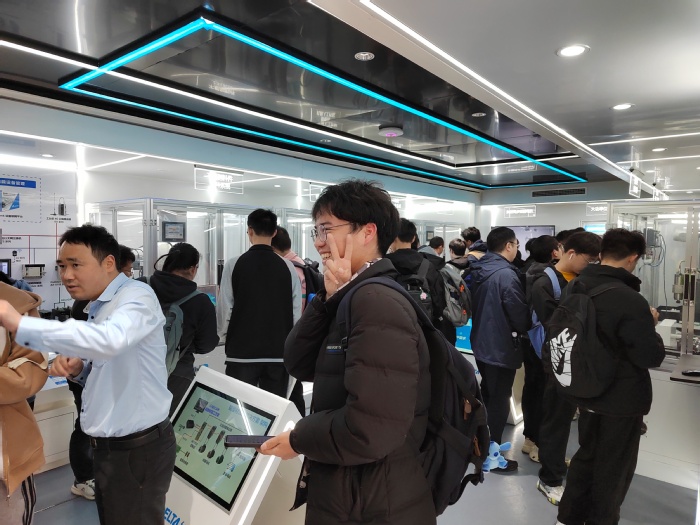 我院的广大师生在中达电通股份有限公司的技术人员的带领下,参观了“偕行双碳 智造未来”减碳之旅展车。减碳之旅产品展示主要包括:台达低碳工厂、光伏发电与储能设备、智能充电场、厂务监控、数据中心、智能楼宇、数字化生产等几个方面。双方在技术合作、校园招聘等方面进行了较深入的交流讨论。