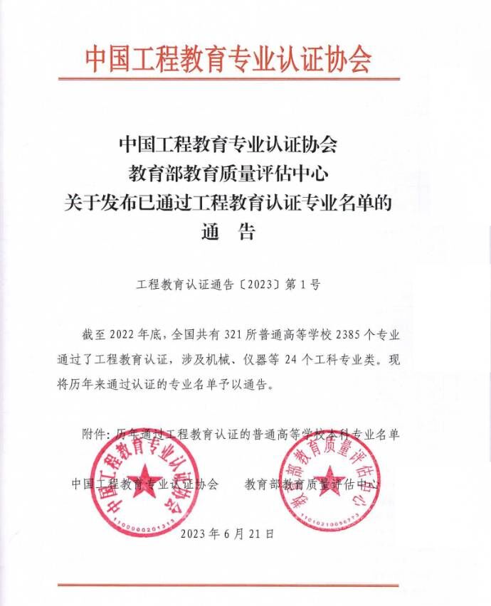 近日,中国工程教育专业认证协会、教育部教育质量评估中心发布《关于发布已通过工程教育认证专业名单的通告》(工程教育认证通过〔2023〕第1号),我院自动化专业名列其中,顺利通过认证,有效期为6年(2023年1月至2028年12月)。这是我院继电气工程及其自动化专业、电子信息工程专业后,第3个通过工程教育专业认证的专业,标志着我院所有专业全部通过工程教育专业认证。