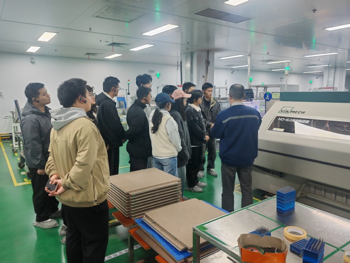 澳弘电子行政部人事总监杨文胜与人事经理胡国庆热情接待了到访师生。在工作人员讲解下,师生了解了公司的发展历程、核心产品的生产工艺,以及员工宿舍、食堂等生活保障设施,从而对企业运营模式、人才需求和人文关怀有了直观认识。随后,师生深入生产车间,实地参观了PCB生产线、精密检测设备以及智能化生产环节。参观结束后,师生与杨文胜总监就行业发展趋势、人才需求以及学生实践能力培养等话题进行了深入交流。杨文胜分享了职业规划方面的建议,学生们也积极提问并现场投递了简历。最后,双方签订了社会实践基地共建协议,建立了实践合作关系。