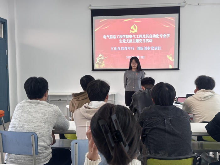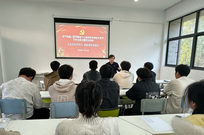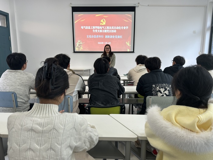 11月13日下午,我院电气工程及其自动化专业学生党支部在“一站式”学生社区7C221党团活动室,举办“文化自信青年行,创新创业党旗红”主题党日活动。本次活动由支部书记徐霞主持,与会人员包括支部师生党员以及2025级本专业递交了入党申请书的学生代表。